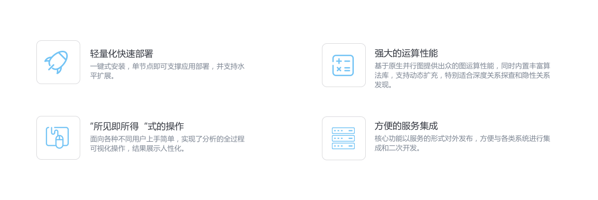 基于知识图谱手艺提供知识接入、知识盘算、知识推理以及知识可视化能力,,,,,通过面向效劳的平台架构、图盘算引擎、交互式语义剖析、大规模数据处置惩罚,,,,,富厚的图挖掘和路径妄想算法,,,,,助力知识驱动智能。。。