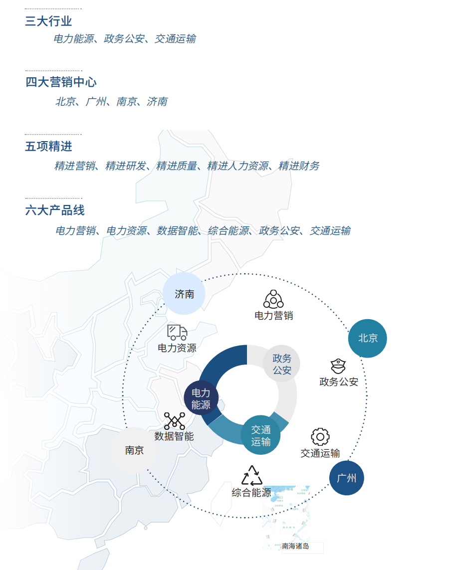 公司聚焦电力能源、政务公安和交通运输三大行业,,,,,以北京、广州、南京和济南为中心,,,,,构建笼罩天下的市场营销及效劳网络,,,,,依托富厚的产品系统、精进的立异研发系统、高效的效劳系统、可靠的质量治理系统,,,,,打造完善的行业解决计划,,,,,为天下800多家客户一连交付优质的数字化产品与效劳。。。。