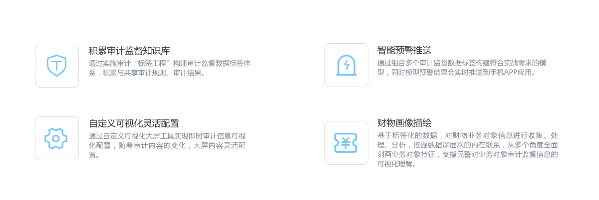 以大数据手艺基础,,,,,,“标签工程”头脑为指导,,,,,,连系对审计监视营业及数据的深刻明确,,,,,,构建了一套审计监视数据标签系统,,,,,,实现了对审计监视营业规则的“整合、应用、共享”,,,,,,同针对审计监视预警信息提供了智能化推送,,,,,,为审计历程减负提供了有力支持。。。。