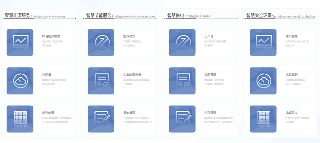 平台在能源治理及泛在物联网两个偏向提供信息化解决计划。。。。在能源治理偏向,,,面向综合能源效劳商、自力售电商、种种园区及用能企业,,,提供智慧售电、能源监测、配网运维、能效及节能治理、景物储平漫衍式能源治理、需求响应、多能协同控制、能源大数据剖析、能源客户效劳等种种能源信息化解决计划;;;;;;;在泛在物联网偏向,,,依托自主研发的海量数据收罗平台,,,可提供对电、水、热、冷、气等多种能源以及种种智能终端的数据收罗、实时监控与剖析统计,,,并提供智能楼宇、智慧家居、智慧照明、电动汽车及充电桩治理等多种物联网解决计划。。。。