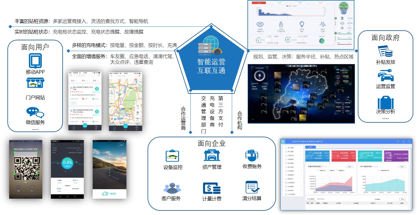 面向运营商,,,提供运营治理所需的装备监控、资产治理、计量计费、收费账务、客户效劳、清分结算等营业支持功效;;;;;;;同时构建充电设施数据资源池,,,实现运营商之间的数据互联互通,,,整合所有的电动汽车平台资源,,,充分实现资源共享,,,打造电动汽车运营生态圈。。。。
