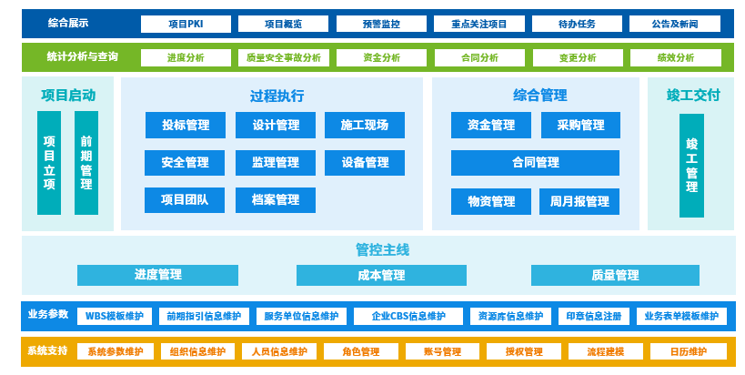 按策划和决议、立项准备、项目实验到完工交付四个阶段对工程项目举行全历程治理,,,,实现对项目概预算、进度、物资、质量、条约、本钱、分包、机械装备、文档等营业的全笼罩和全管控,,,,并通过对各环节的资源整合,,,,实现营业流、信息流、资金流、物流、控制流的统一。。。
