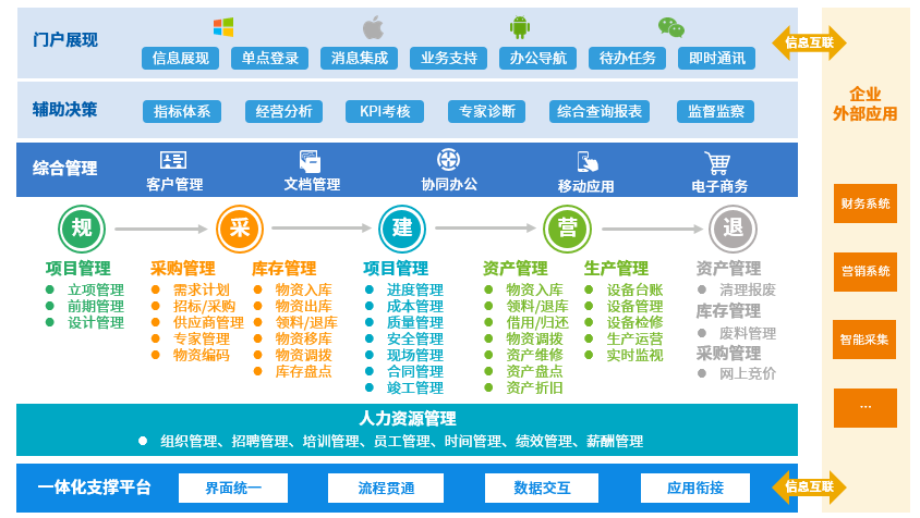 集物资供应链治理、工程项目治理、人力资源治理于一体,,,形成无缝数字化的营业治理一体化管控平台。。。平台统筹妄想项目立项、招投标、工程设计、采购、仓储、工程施工等营业,,,横向上突破各部分的营业壁垒,,,实现营业之间信息的意会;;;;;纵向上增强对信息的透明监控,,,提高总部对下级单位的管控力度,,,降低治理本钱,,,确保焦点资源价值的最大化。。。