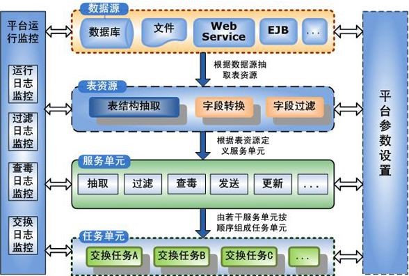 数据交流平台由治理控制层与传输层组成,,,,,,治理控制层提供平台治理、吸收治理、发送治理等治理功效和数据吸收效劳、数据发送效劳、数据抽取效劳、数据校验效劳等一系列效劳功效;;;;传输层提供基于新闻、Web Service等多种协议的传输通道。。。。