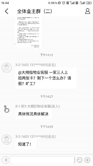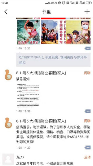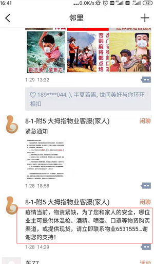 疫情眼前,,,,,天天各人通过邻里圈、邻聊相同生涯、事情、防疫步伐,,,,,业主们真正体会到了守护在自己家园的物业人的支付与真诚。。。当看到软件邻里圈中,,,,,物业员工发出物资欠缺的求援后,,,,,自行组织将自己的防护物资提供到物业人手中,,,,,助力疫情防控事情。。。一张口罩、一把体温枪、一瓶消毒水就是物业抵御病毒的所有武器。。。4号楼2单位1503的业主听闻后,,,,,给我们送来了100枚口罩,,,,,3号楼2单位703的业主送来消毒液、1号楼赵姨妈和4号楼的陈姨妈天天带着红袖标义务帮我们门岗执勤......物业人也被感动着,,,,,更有斗志投入到这场无声的硝烟中。。。邻里圈里随处是分享、是感动,,,,,是爱心、是相助......